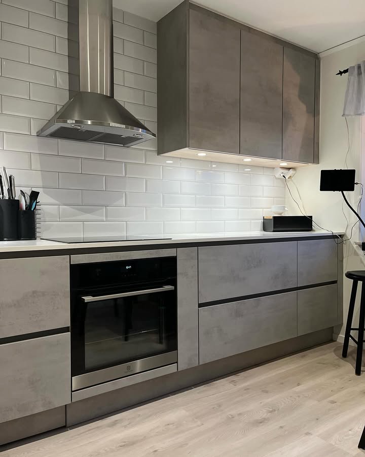 Nordanro Premium. Lucka: Natur Betong skiffergrå. Bänkskiva: 787 Ek reproduktion. Butik: Elon Kapitalvarucenter Bladh AB, Helsingborg & Höganäs