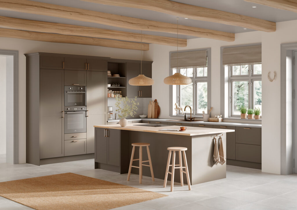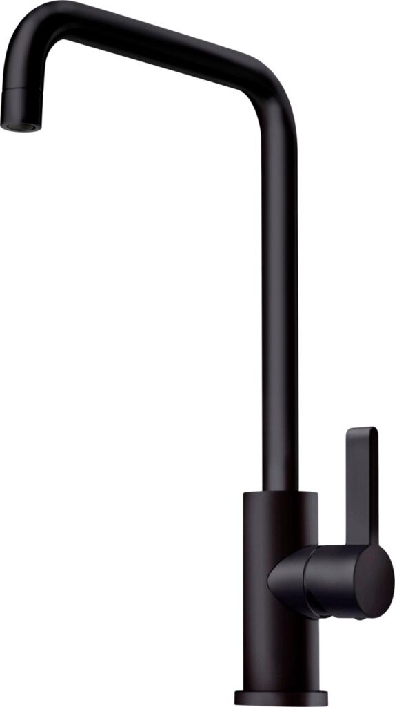 Addera en modern svart blandare för att skapa en kontrast till eken i bänkskivan och de dämpade luckorna. RT2 980