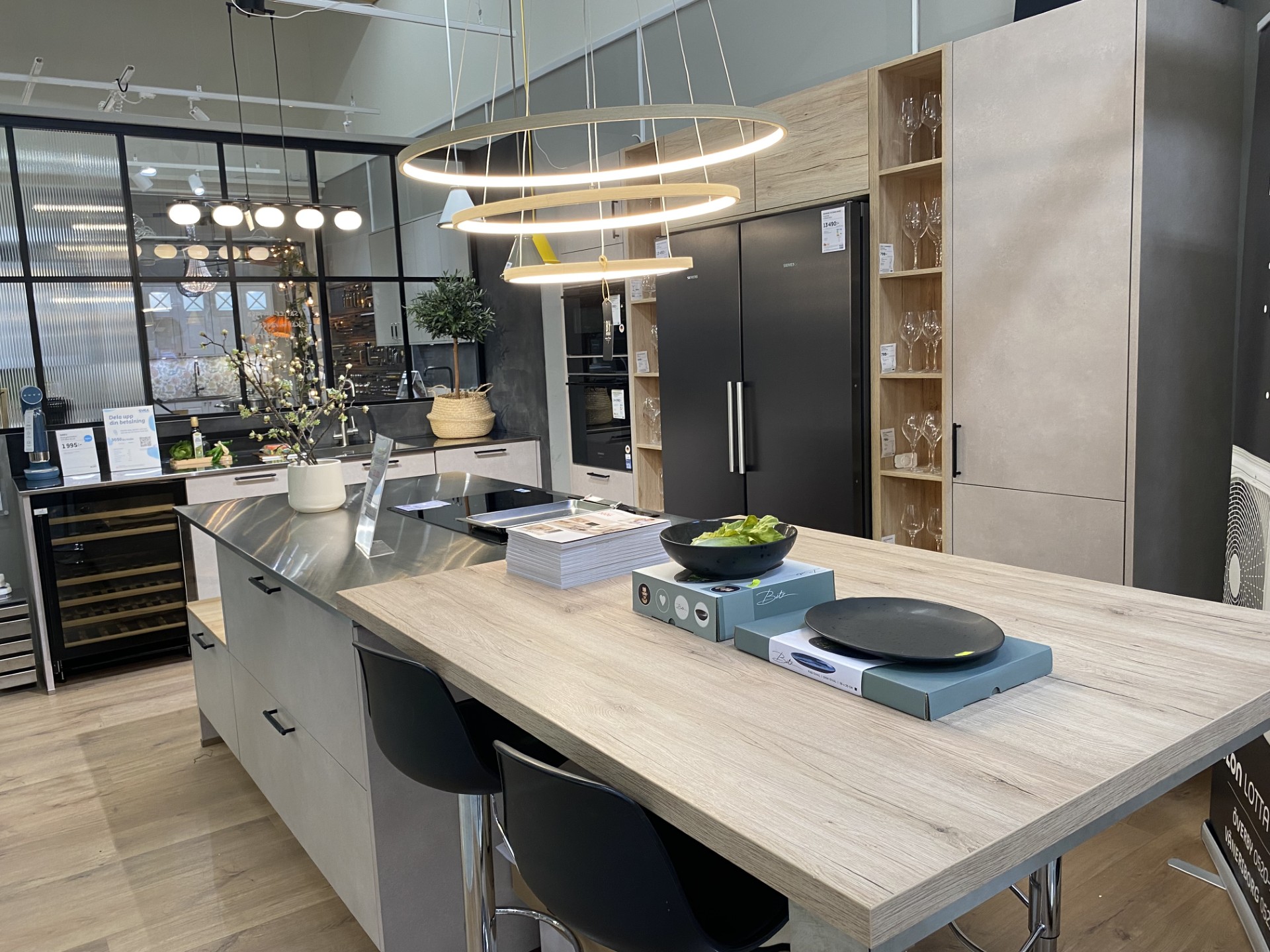 - Öppna hyllor med integrerad belysning.