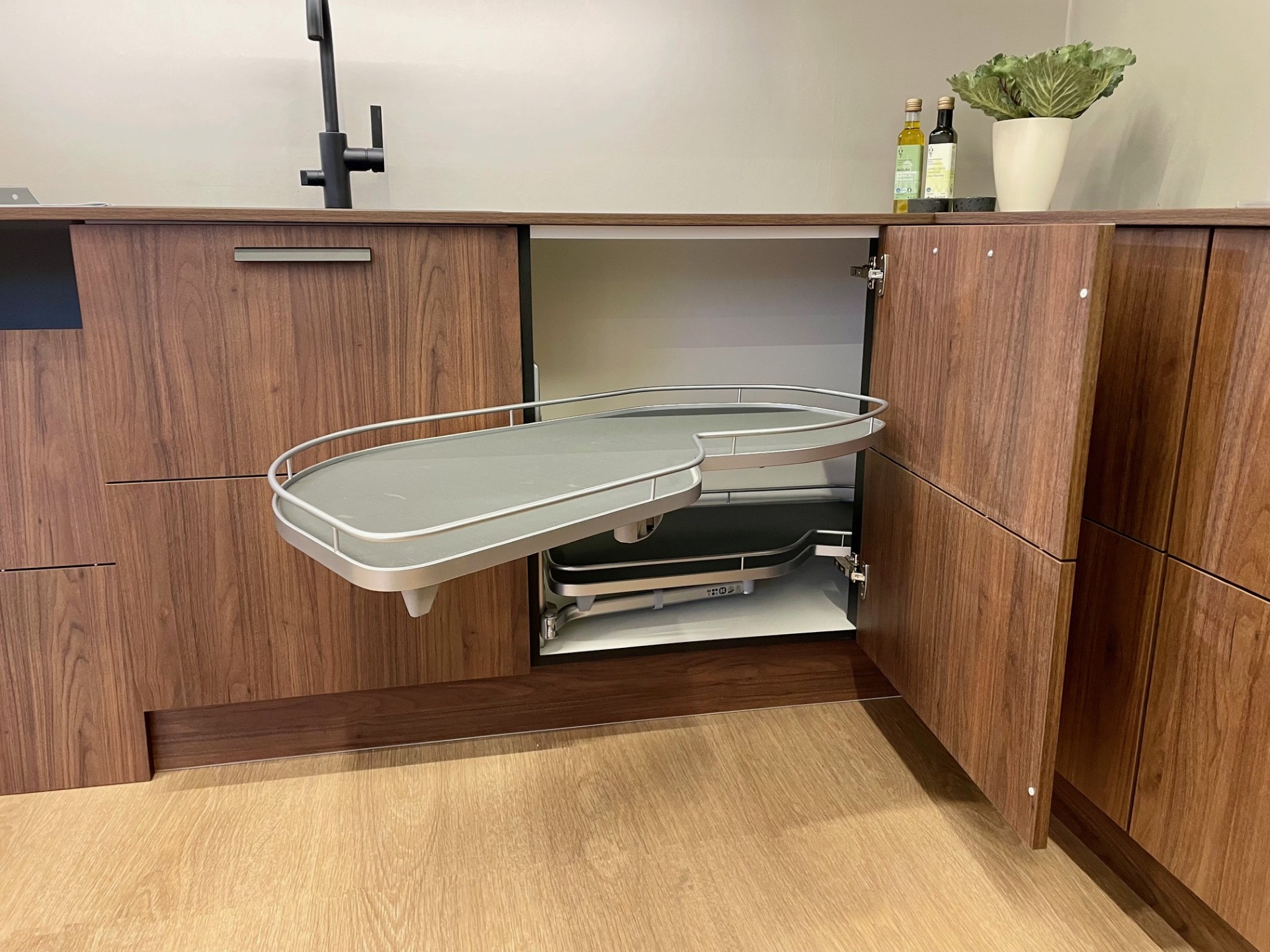 Inredning: Bestickinsatser, Sopsortering, Utdrag med 2 hyllplan för rengöringsmedel, Skafferilåda med dropp och ventilationsbotten, Högskåp med apoteksutdrag.